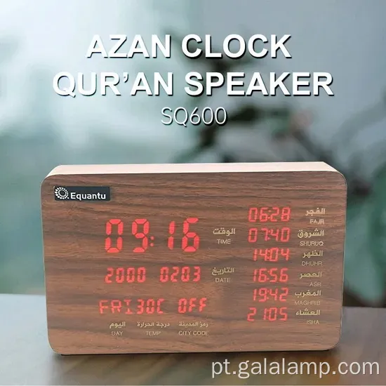 Encantu SQ600 Livro muçulmano Alcorão Alcorão Madina Mushaf Dua Haji Haji Wood Clock Athan Alcocor Descrição do produto O Alcorão do Speaker Azan Clock é um produto especial para os muçulmanos que usam , que é com função dupla (despertador, aprendizado do Alcorão). É um alto-falante do relógio com recitação total do Alcorão nobre, usando controle remoto para selecionar o Audio do Alcorão, configuração de tempo e ouvir o Alcorão com voz de alta qualidade. Madeira natural para criar uma sensação de primeira classe, recursos exclusivos são projetados para Haji Azan Salat. | |||||||||