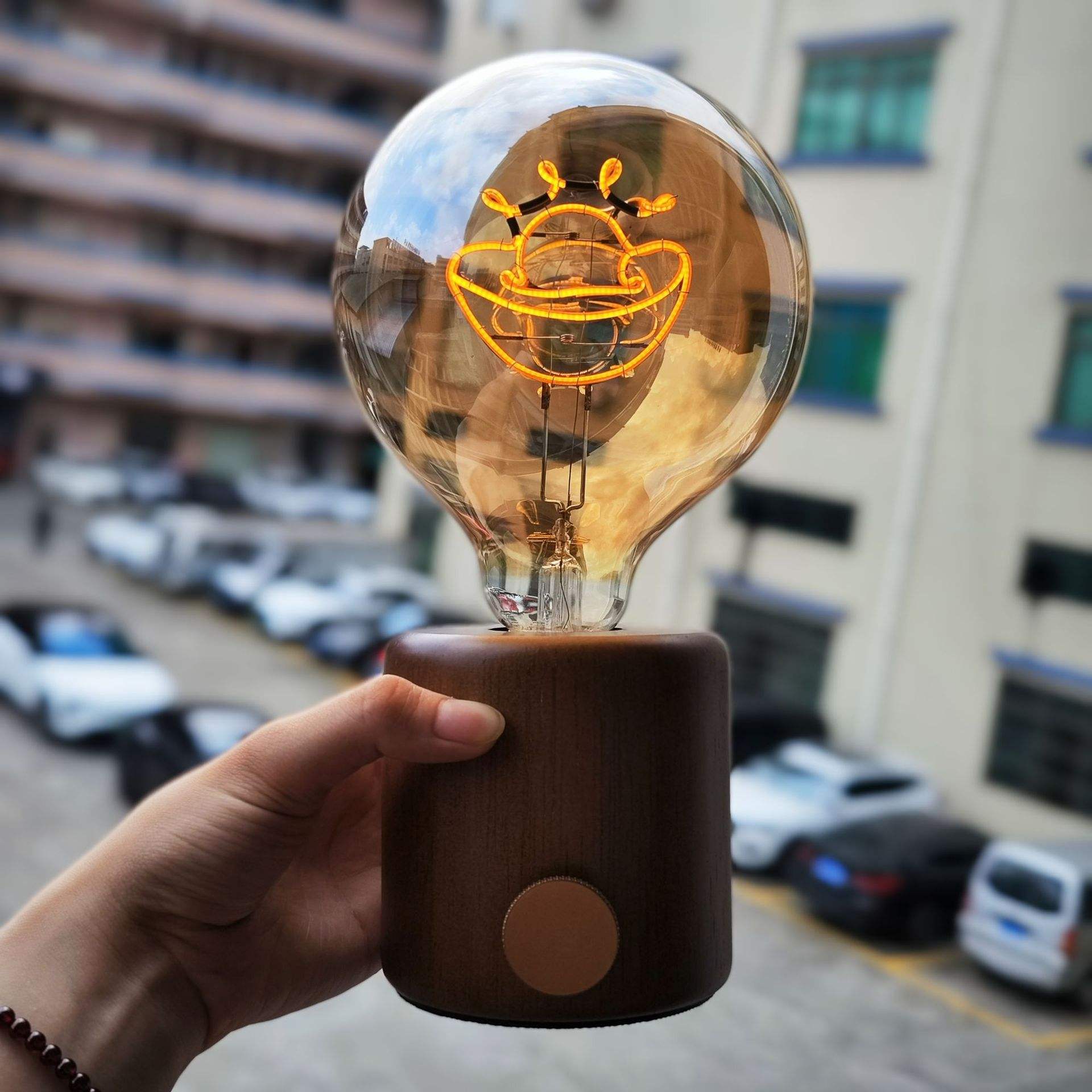 demonstração de lâmpada de humor recarregável de madeira vintage